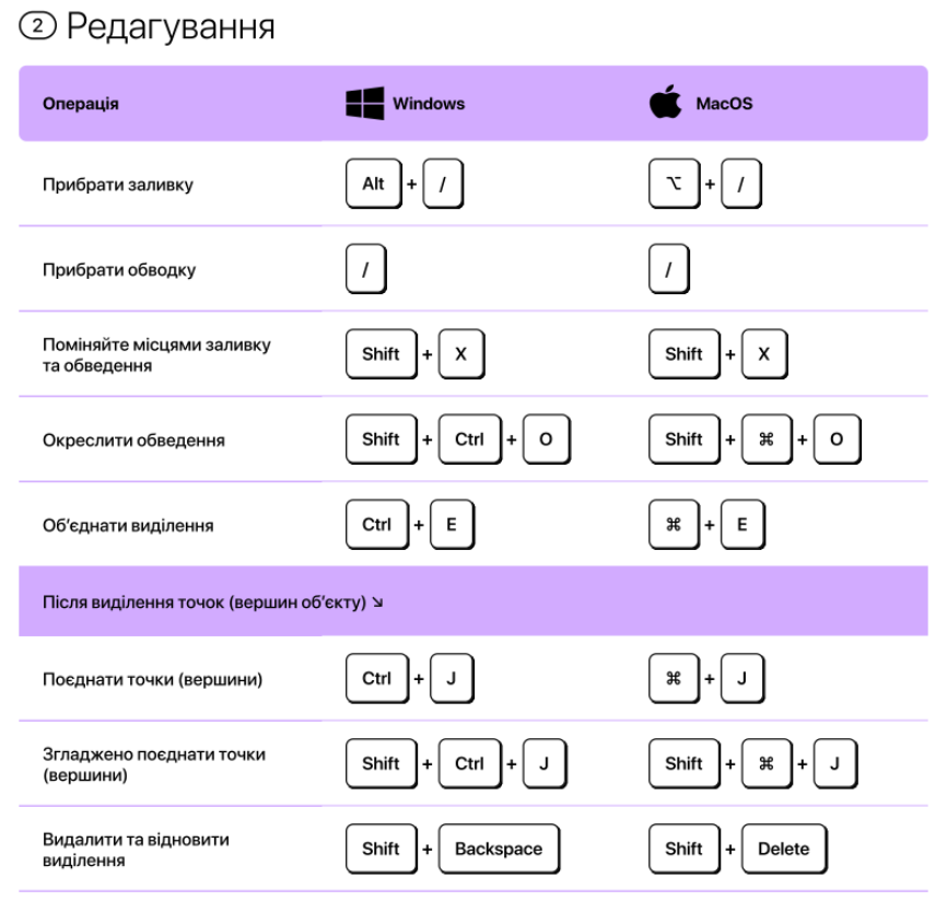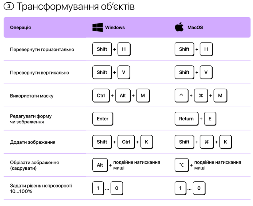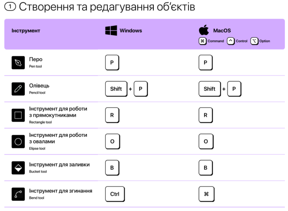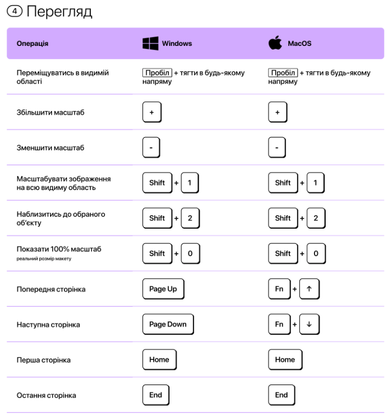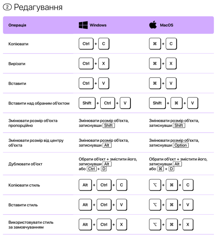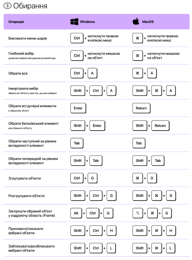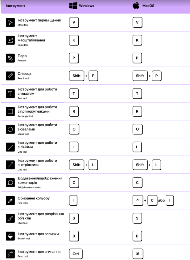Для пришвидшення роботі з Фігмою, можно використовувати гарячі клавіші.