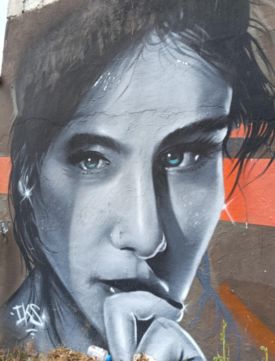 I don't know if this is someone famous or not. I don't recognize her, but I was just happy when I rounded a corner and saw this painted on the side of a cement storage shed of sorts. I moved in a bit closer to check to see if it was spray because until you get really close, it is tough to distinguish between the two.