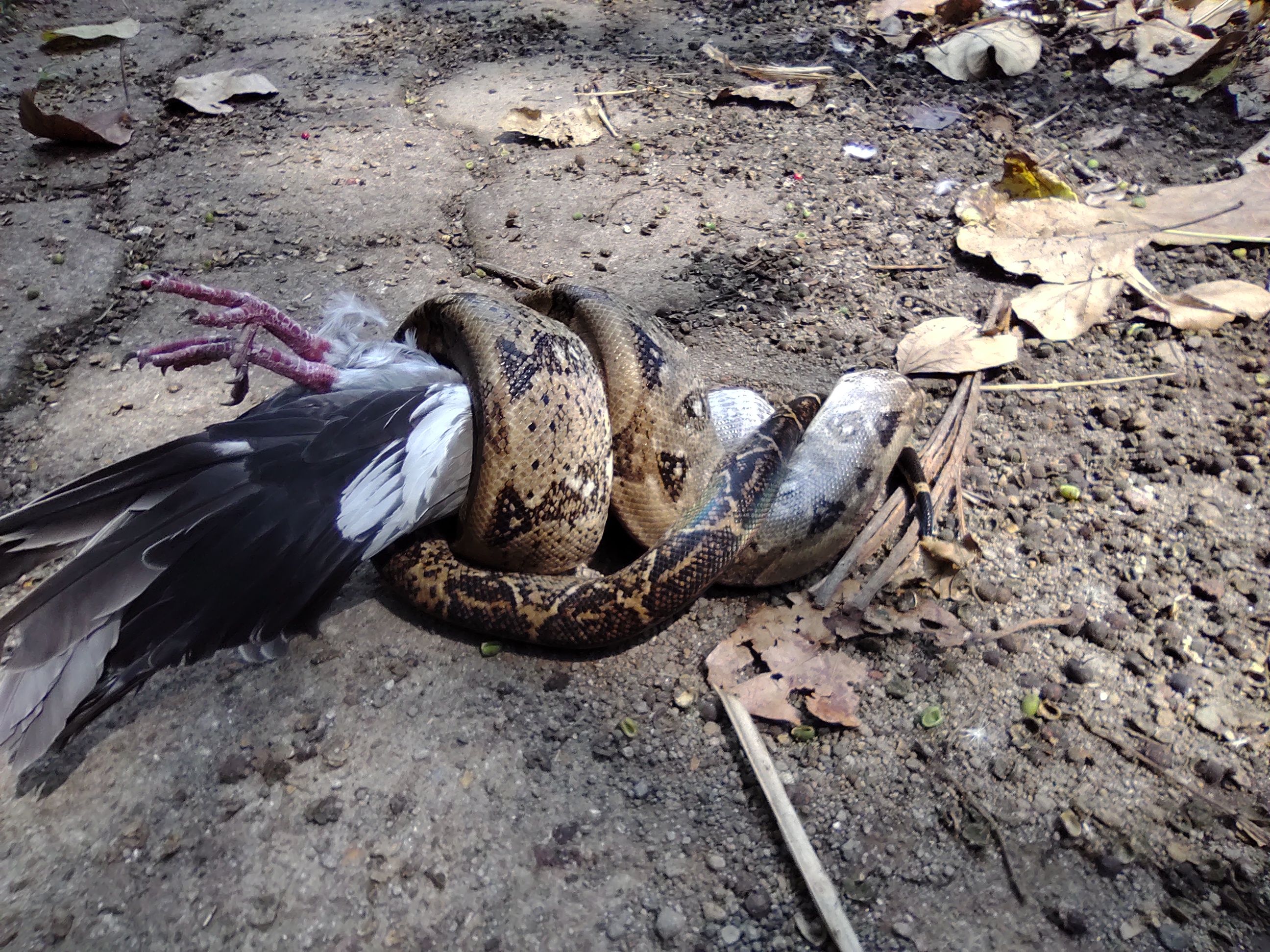 Some days ago we were walking in the park near to home and, fortunately we found a beautifully scene, a snake which was eating a dove, i have never seen some like this.