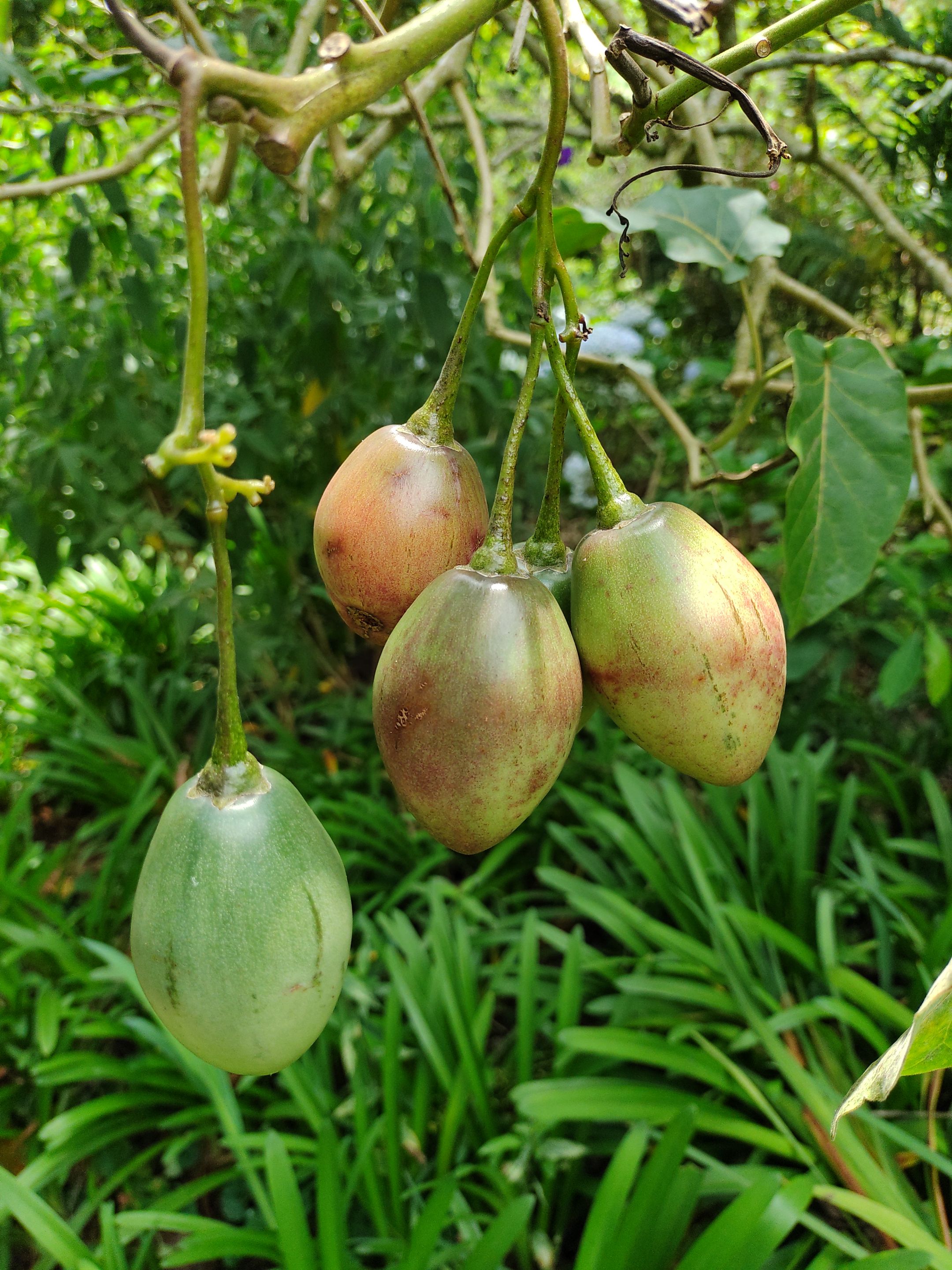 The tree has many branches intertwined with its stems, forming a wide network of thin branches that appear to be woody, allowing them to support the weight of the fruit. And the fruit is amazing! The tree tomatoes are a unique species with an oval or egg-shaped form, and a diameter of about 7-10 cm. Their skin is strong and elastic, which protects them from falls and cold climates.