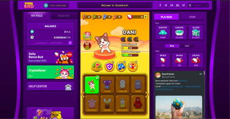 Overall, DozerBird is a simplistic dApp that blatantly imitates the Flappy Bird game design. It does heavily revolve around paying to play, with the game requiring energy tokens to play and purchasing in-game items to make its sensitive physics a bit easier to manage.