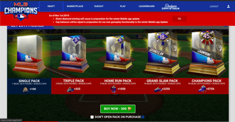 There are two ways to purchase a figurine, either by drafting a pack or via other players in the market place. If you choose to draft, you’ll need the in-game currency called Diamonds, which are quite affordable with a bundle of 500 Diamonds costing 0.027 ETH. One Draft Pack costs 500 Diamonds, along with it comes 1 MLB Figurine unveiled randomly and bonus caps. These Caps are used to purchase Team Reward Packs, which contain Players from specific teams and have rare attributes.