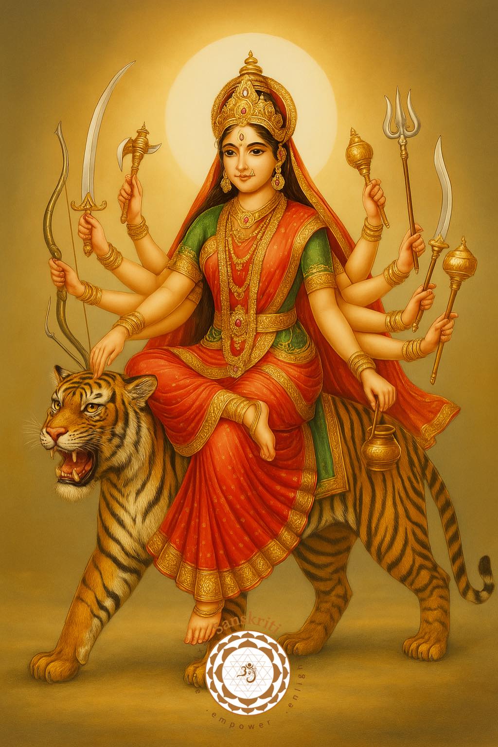 Goddess Chandraghanta, the married form of Goddess Parvati, represents justice and strength, the beauty, bravery, serenity, and courage of the Divine Mother. According to Hindu scriptures and Drik Panchang, Maa Chandraghanta is the married form of Goddess Parvati, representing peace and welfare for her devotees. After her union with Lord Shiva, it is said that Goddess Mahagauri started adorning her forehead with a half crescent moon (Chandra), which looks like a bell (Ghanta), and hence she is called Maa Chandraghanta. She is riding a tiger, holding varied weapons in her ten hands.