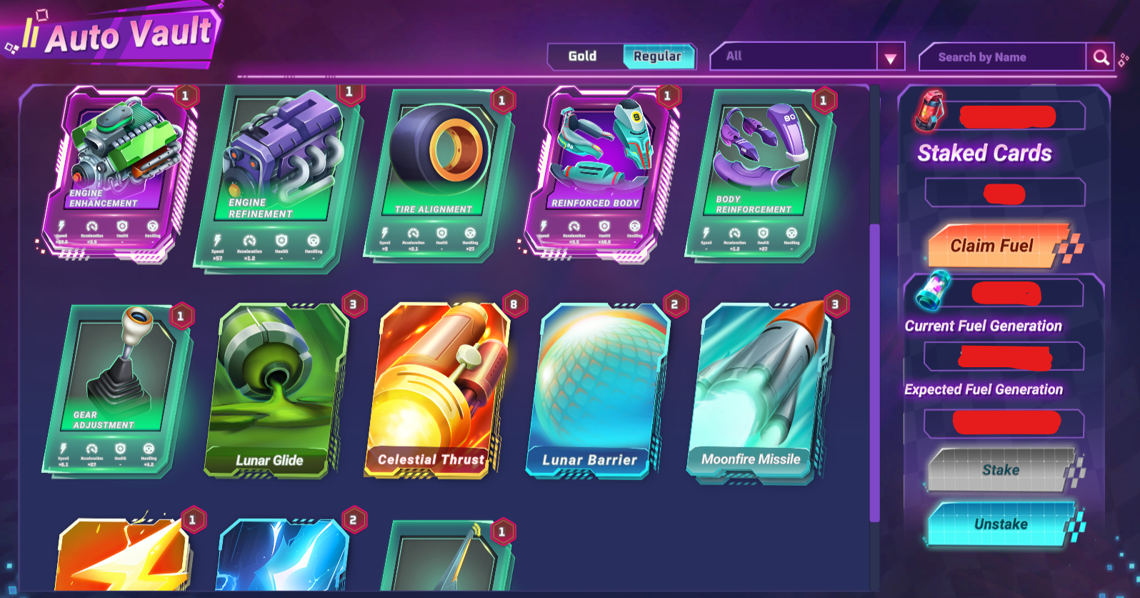 The Auto Vault is a core mechanic in Moon Karts where you stake unused cards to generate fuel, the resource you need for racing. The fuel you gain depends on the rarity and type of the cards you stake—higher rarity cards generate faster.