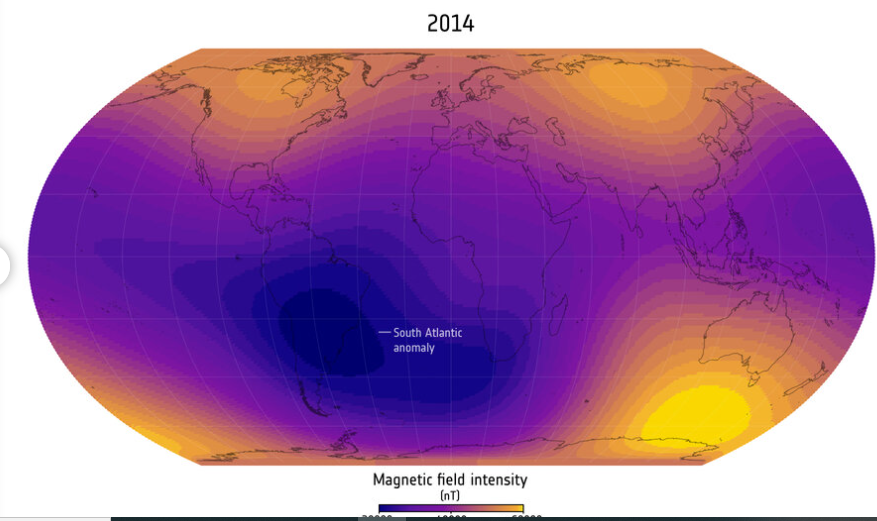 The yellow spot shown, which is the opposite, is a point of strengthening of the Earth's magnetic field under Australia, what happens is that it is strengthened in an area where no one lives, that is the problem.