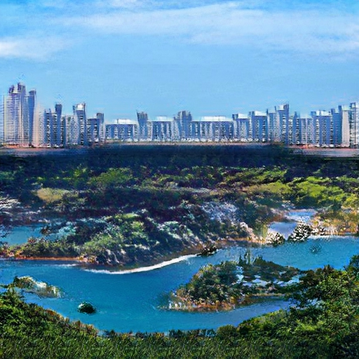 I wanted to include in this drawing a blue sky. The clouds are light and scattered. This will offset the various dark colors of the surface. Then I added some small rocks on the coastline. The water feature twists and curves with greenery in the form of trees and bushes. For the middle of the scene, I added a background that resembled a city skyline.