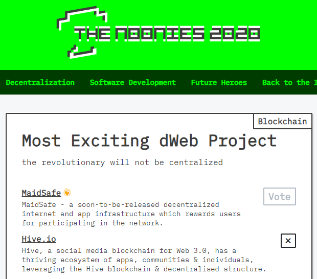 It's that time of year again when HackerNoon does their annual "Noonie" awards and this year HIVE has been nominated. Meaning we all need to go make an effort to go and vote on our blockchain. Currently the vaporware known as maidsafe is in the pole position with HIVE a close second.