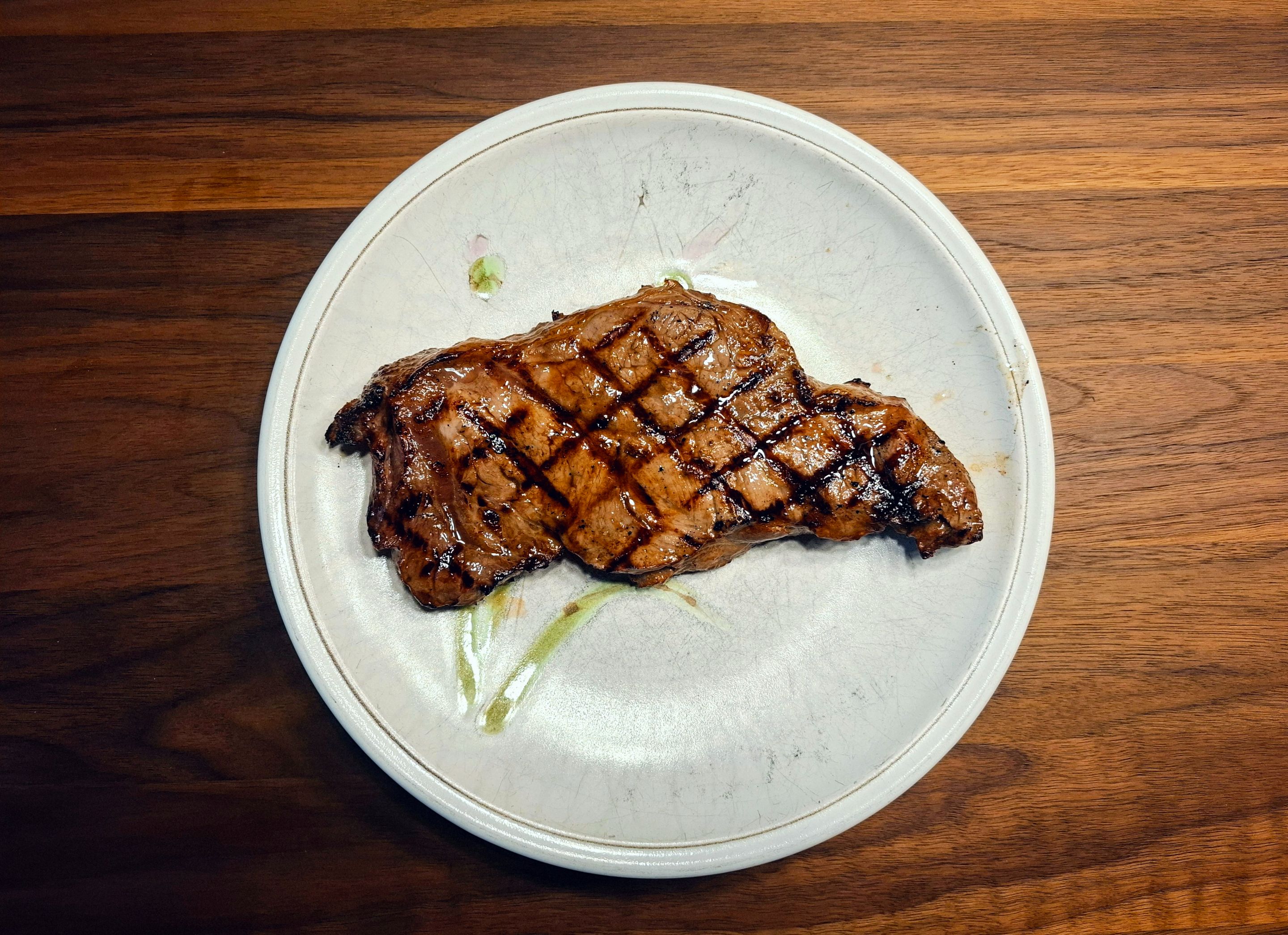 Steak is another meal I rarely make. Its expensive and I often don't really even care for it. I find it tough and lacking flavor. Its another one that we buy only on occasion. I marinated this one. Check out the cross hatching I did on the BBQ. Its actually very easy to achieve. Place it on the grill on a 45° angle, let it sit and minute or two depending on the thickness of the steak and then shift it to the opposite side at a 45° angle. Then do the same when you flip the steak over. Does that make any sense to anyone?