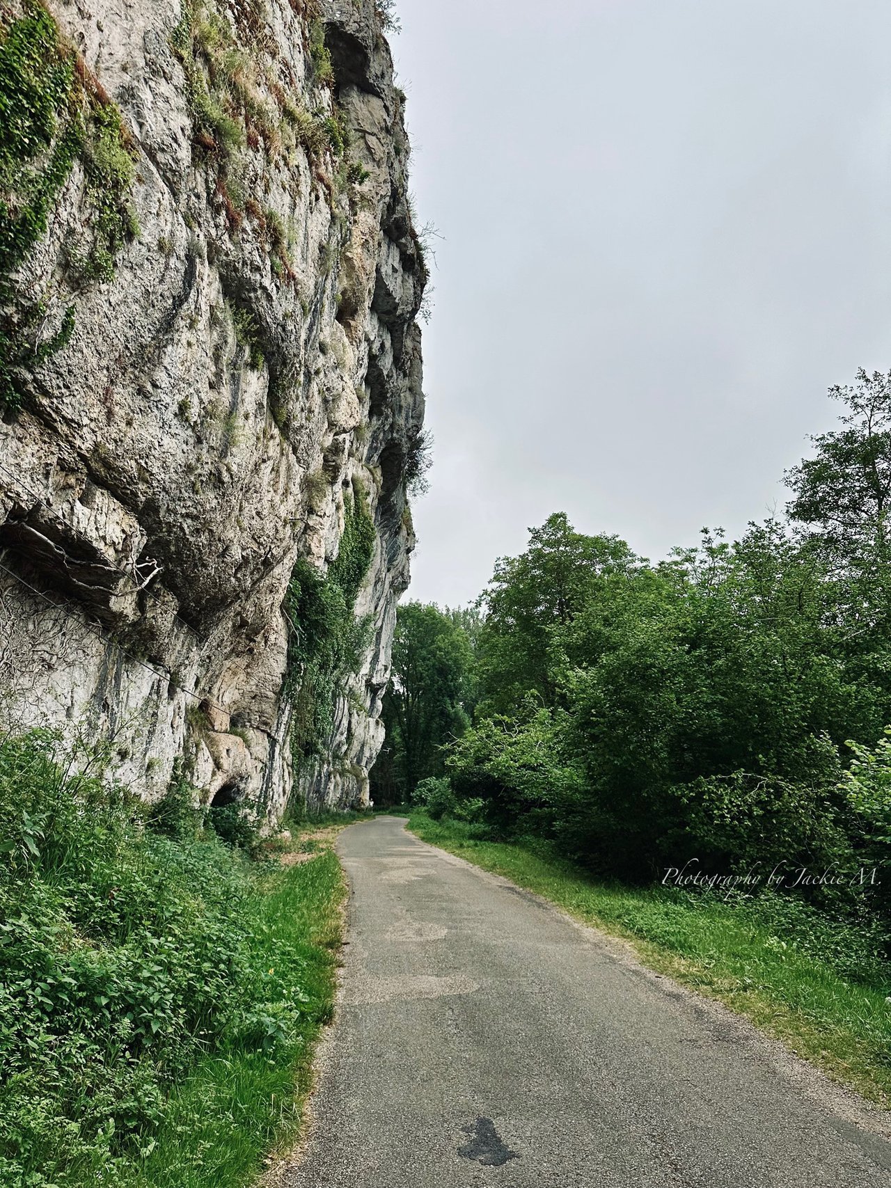 After a little while we find ourselves under the village, along the very high cliffs / rock facade. The Lot river is very close by now. A little wall runs next to the road.