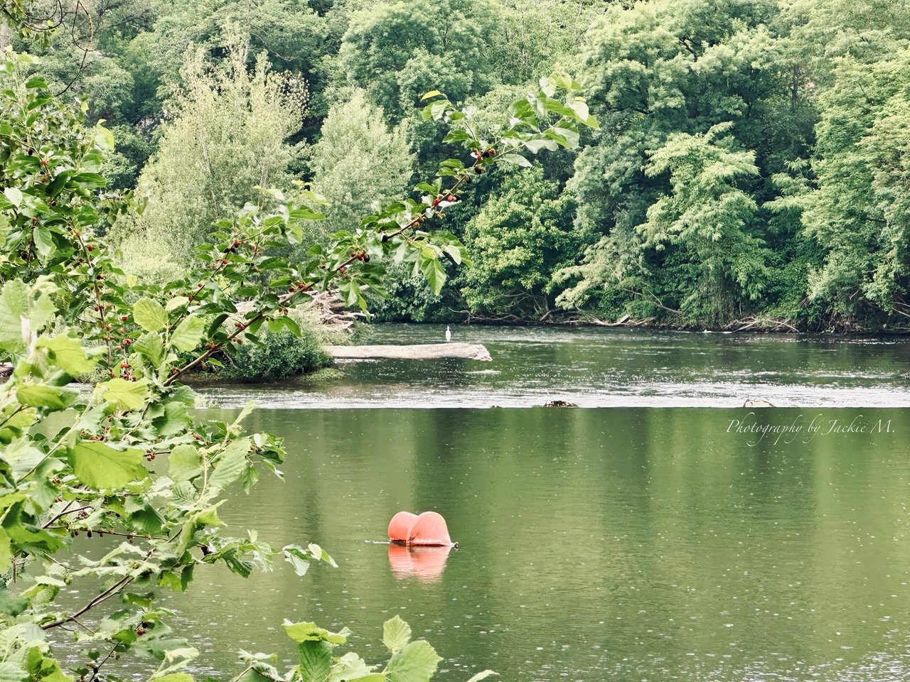 Let me zoom in for you. A heron… sitting on a tree trunk waiting for fish to come by. Do you see him?