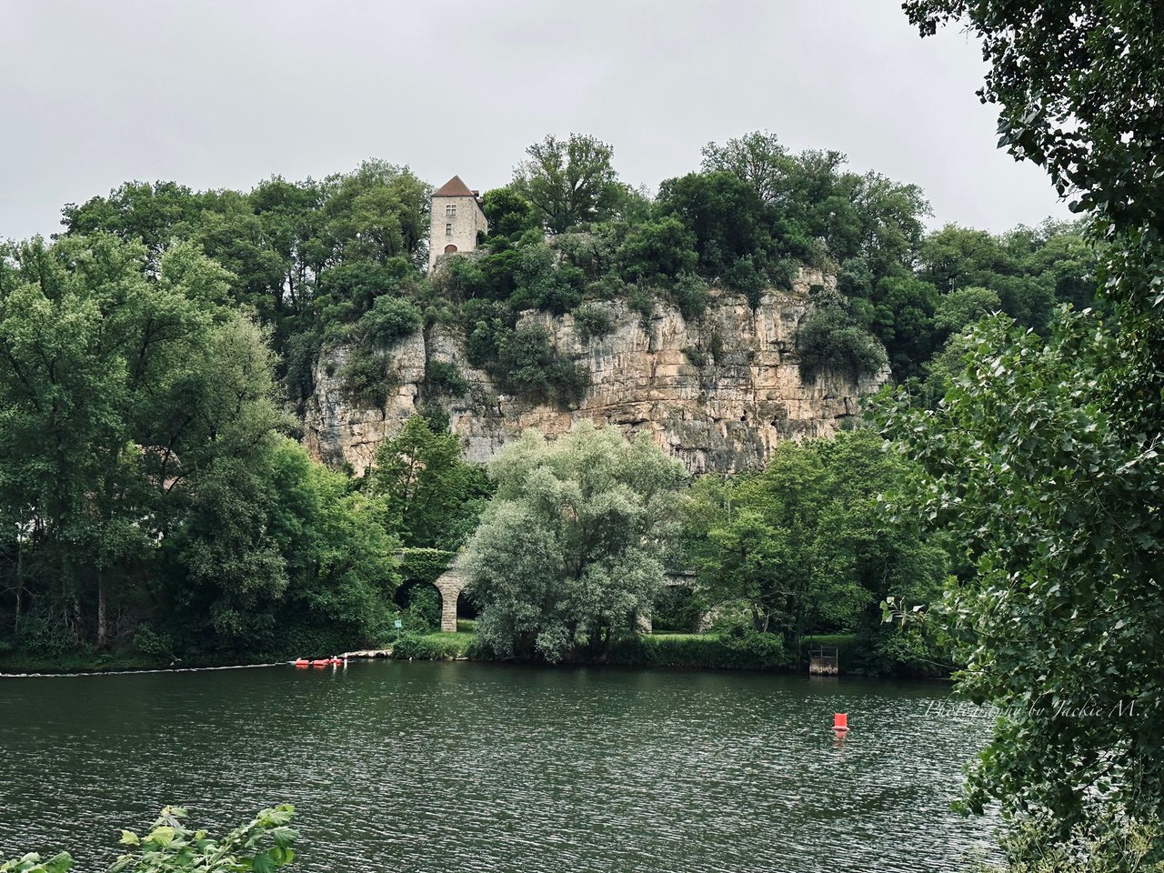 Our view towards the left is breathtaking. I present to you the village of Saint Cirq Lapopie. Perched high on top of the rock / cliffs. We see its old and large church being the dominant feature. The village is behind it. Spread out.