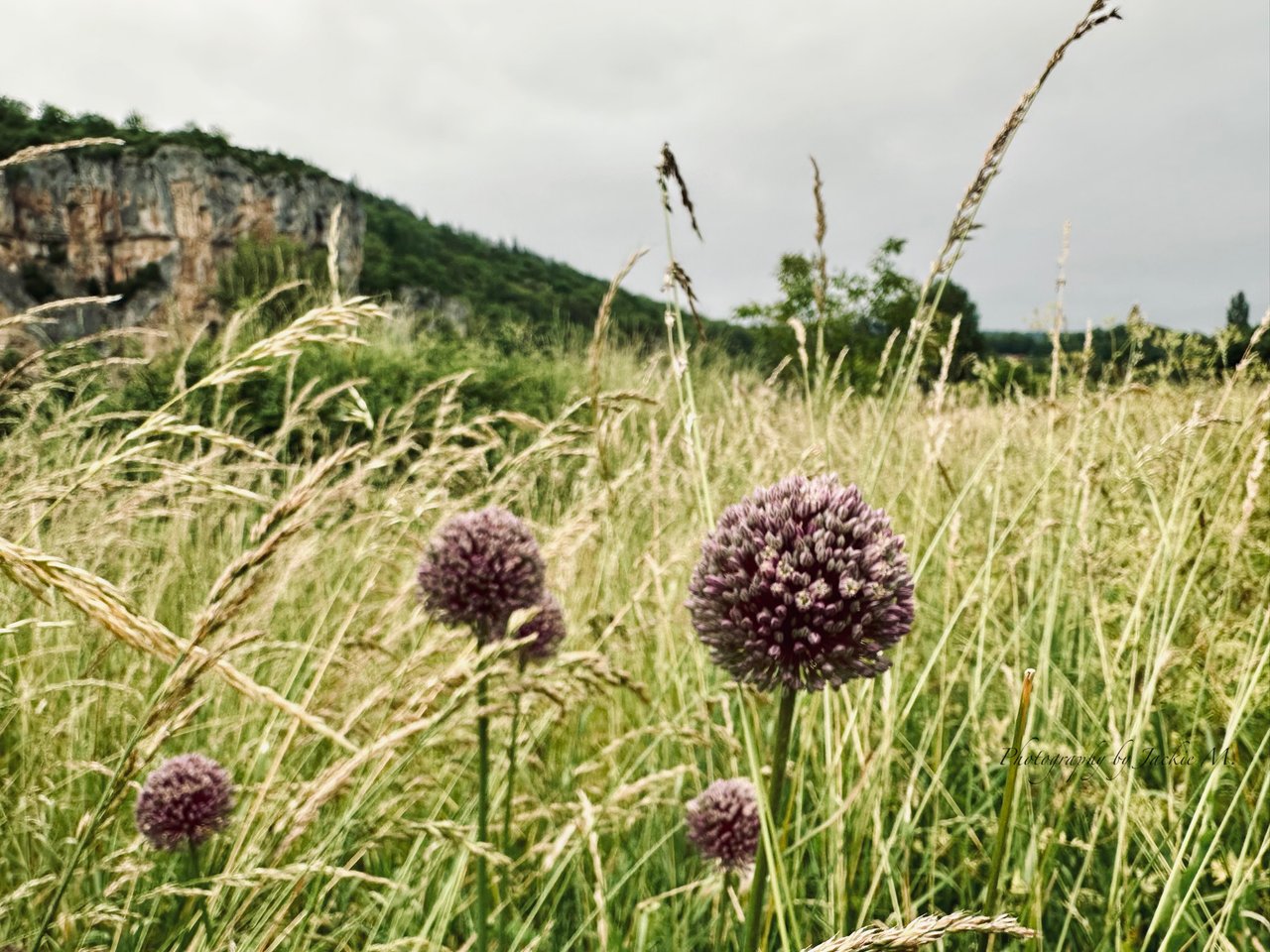 We will walk below it, along the river “LOT”, see some wildlife and pass by a lock. We walk over the footbridge and walls from the lock to enjoy the views of the beautiful old mill “Moulin de l’Aulanac”. As we walk further we walk along the cliff/ and the rock facade will tower high above us probably more than 200 meters. Where the town of Saint Cirq Lapopie is located, all the way on top. Our views along the way will show the village above us from below. We go through fields where we enjoy the birds singing and see hundreds of wildflowers.
