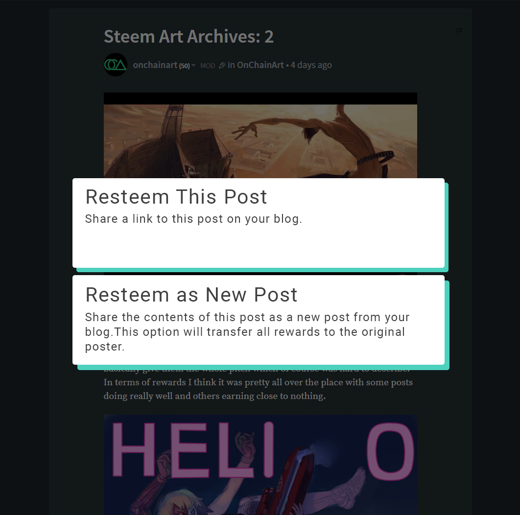 a better place is by sharing old, long dead, but very high in quality posts called the #steemartarchives. I set the artists featured in these posts to 100% beneficiaries which of course not only shares this artwork to a new set of eyes, but also rewards these artists for posts that were no longer eligible for rewards.It hasn't taken long for me to realize that this is extremely powerful and I think worth turning into a feature to incentivise users to share content in this way.