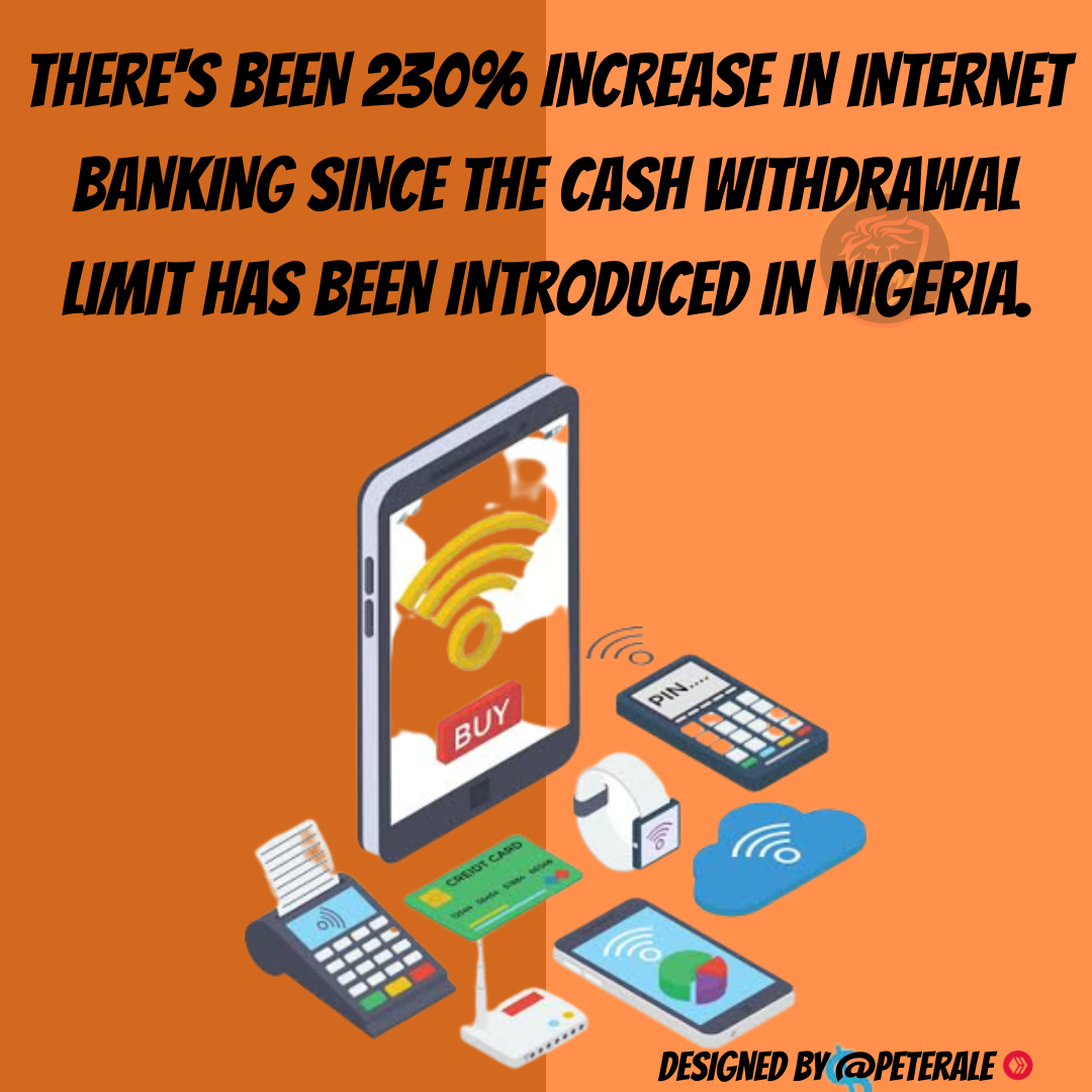 THERE'S BEEN 230% INCREASE IN INTERNET BANKING SINCE THE LIMIT ON CASH WITHDRAWAL HAS BEEN INTRODUCED IN NIGERIA.
