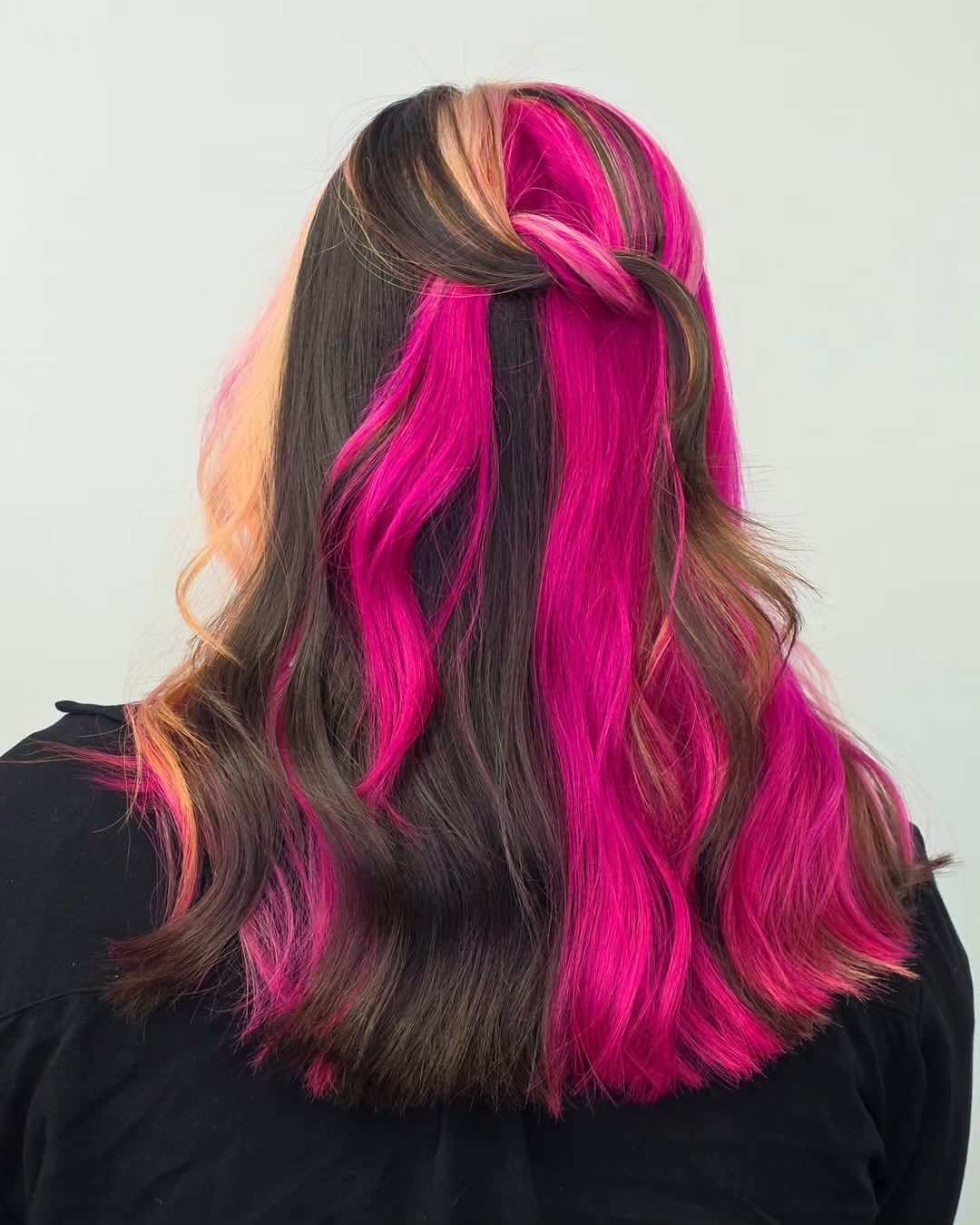 This hairstyle showcases a striking blend of vibrant neon pink and natural brown shades. The color combination is creatively highlighted with a chic half-up twist, adding both texture and interest. Perfect for those seeking to express a bold and playful side, this look provides a pop of color that's both eye-catching and trendsetting. Whether out on the town or enjoying a casual day, you'll feel confident and unique with this vibrant style.
