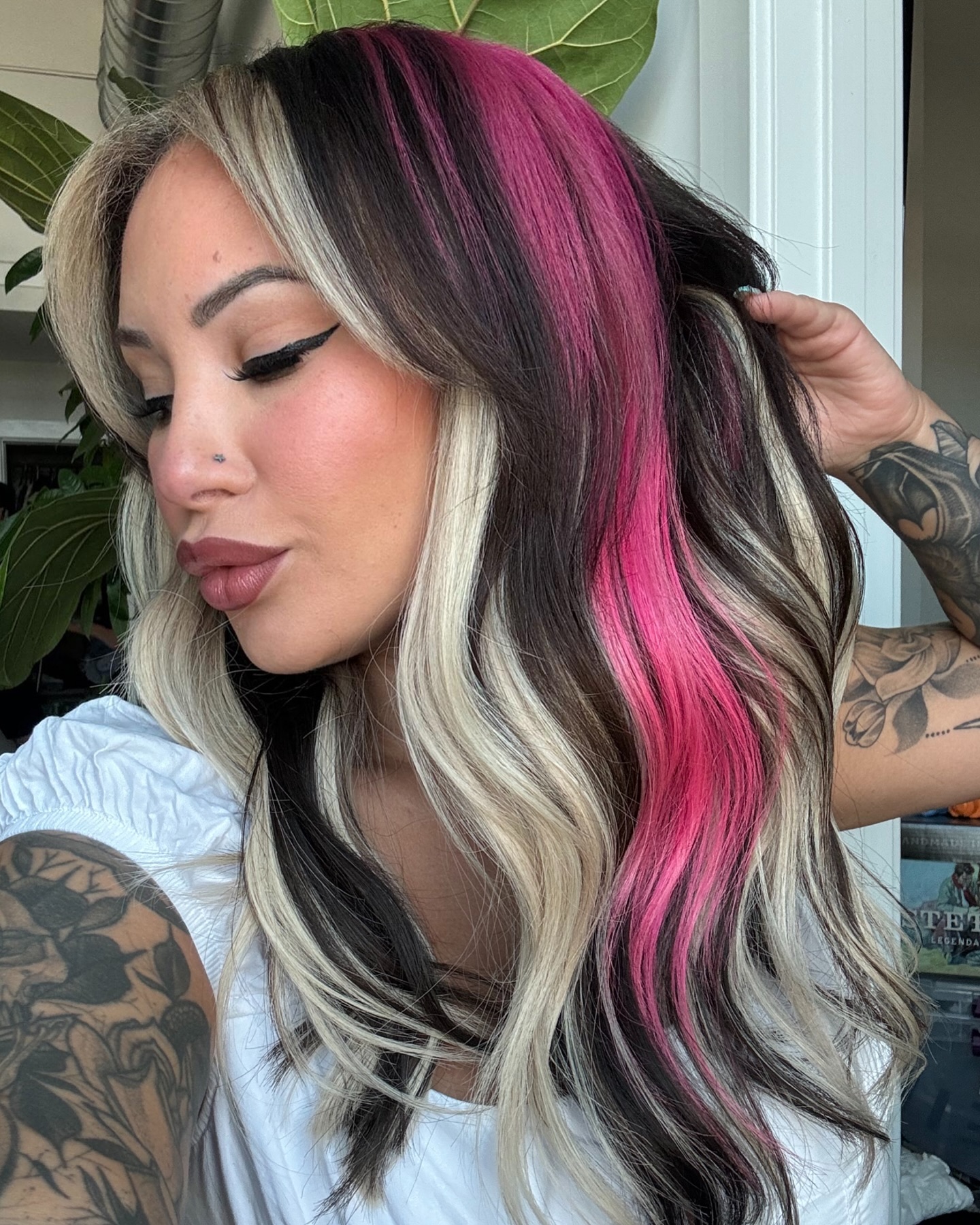 This hairstyle features bold pink highlights mixed with sleek platinum waves, creating a striking contrast. The layers add volume while the vibrant colors bring out a playful yet confident vibe. Perfect for anyone looking to make a statement and stand out effortlessly.
