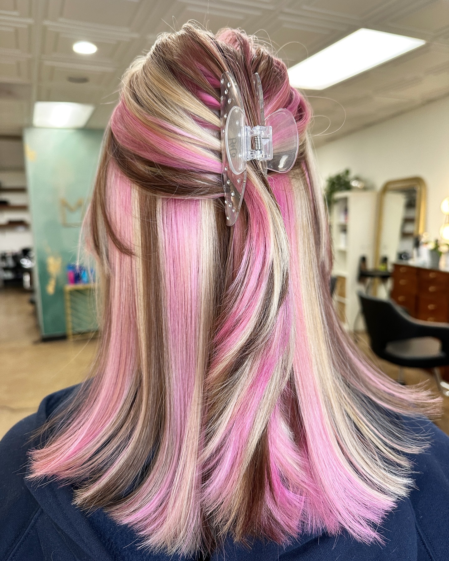 This hairstyle combines playful pink and classic blonde shades to offer a striking new look. The shoulder-length cut is styled with a sleek finish, adding a touch of polish to the vibrancy. Perfect for anyone looking to make a bold statement while feeling confident and stylish.