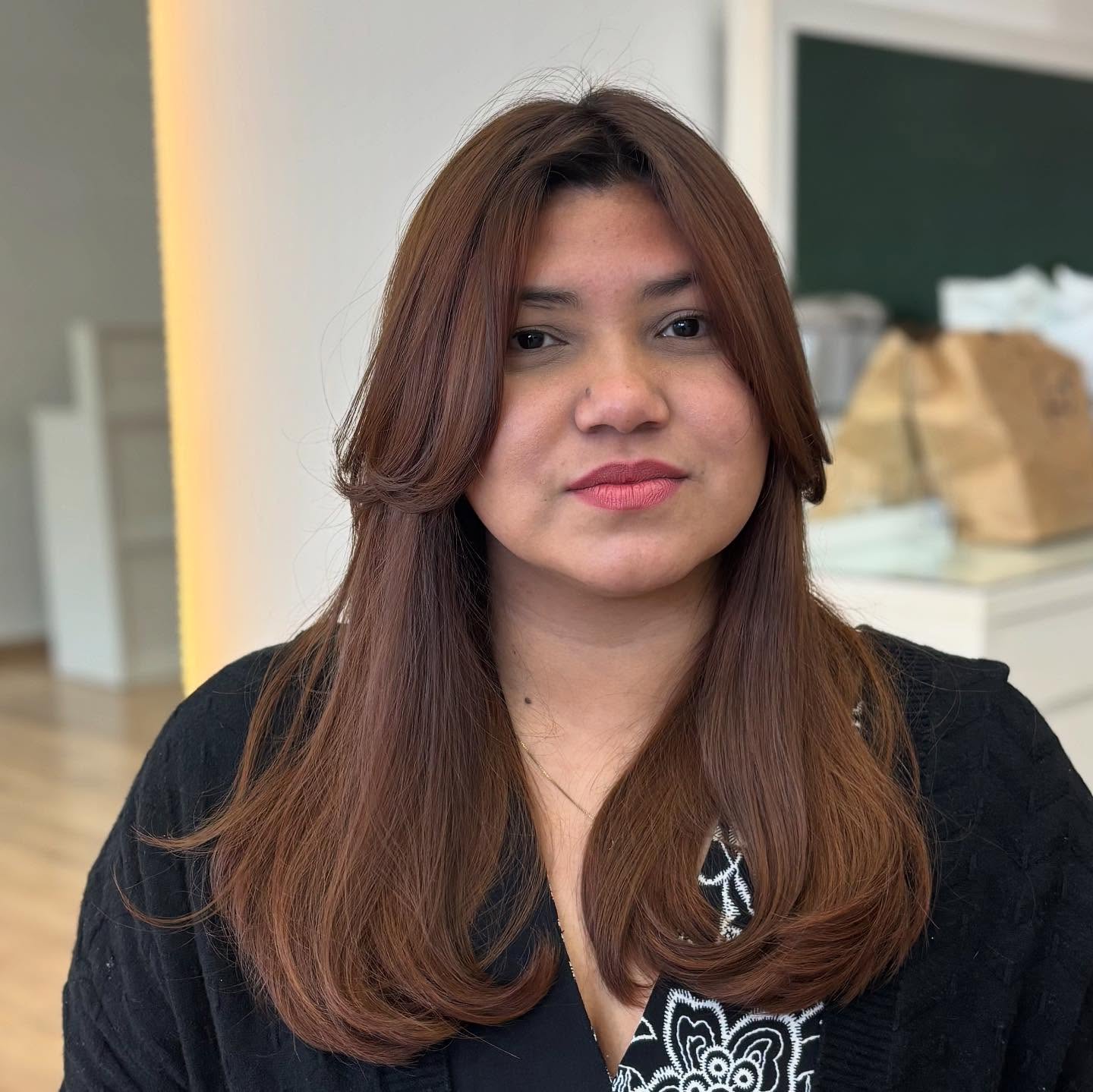 This stunning chestnut brown hairstyle is the perfect way to refresh your look. The smooth, glossy finish pairs beautifully with face-framing layers, enhancing your natural beauty. This style not only feels refined and polished but also adds a touch of confidence. It's perfect for any occasion, offering both versatility and a chic look. Whether you're wearing it down or styling it up, these layers will bring your hair to life.