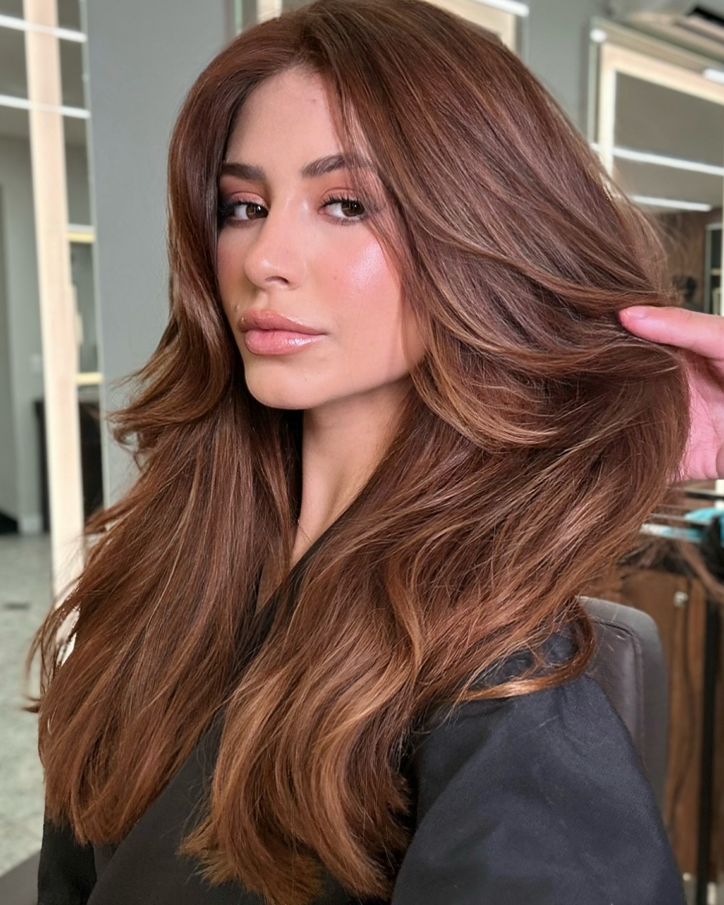 Dive into a world of luscious brown waves with these delightful layers. The natural look is enhanced by soft, textured styling that gives fabulous volume and movement. Whether you're aiming for casual or chic, this hairstyle radiates elegant confidence. Perfect for those who appreciate beauty in simplicity, these layers offer a polished and relaxed vibe, making every day feel like a hair commercial moment.