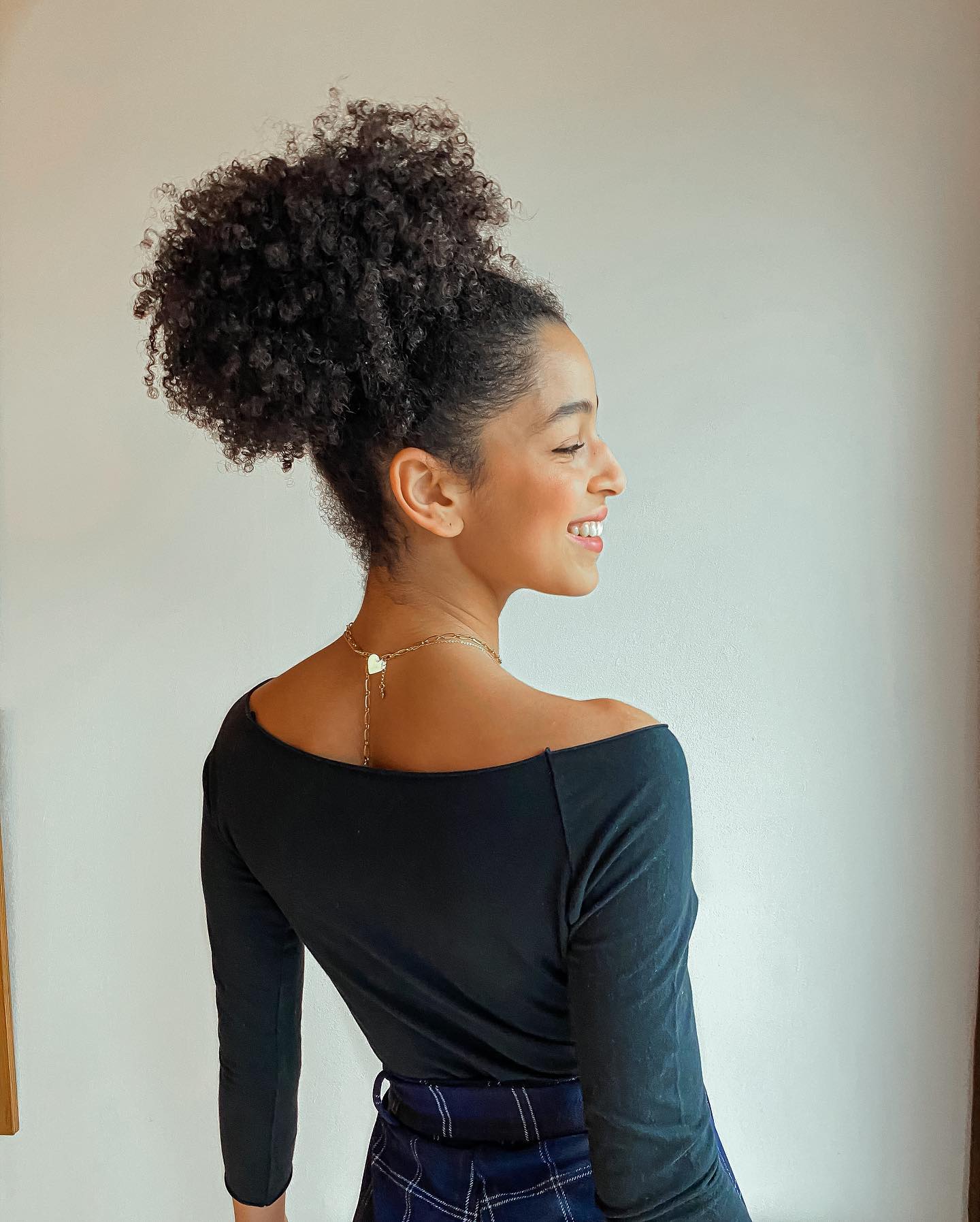 Today's hair is all about height and vibrant curls! This high-volume updo showcases natural curls with a playful texture. Perfect for adding a punch of confidence to your look, this style is great for keeping curls chic and in place. Whether it's a casual day out or a special occasion, this updo fits the bill perfectly, keeping it both stylish and carefree.