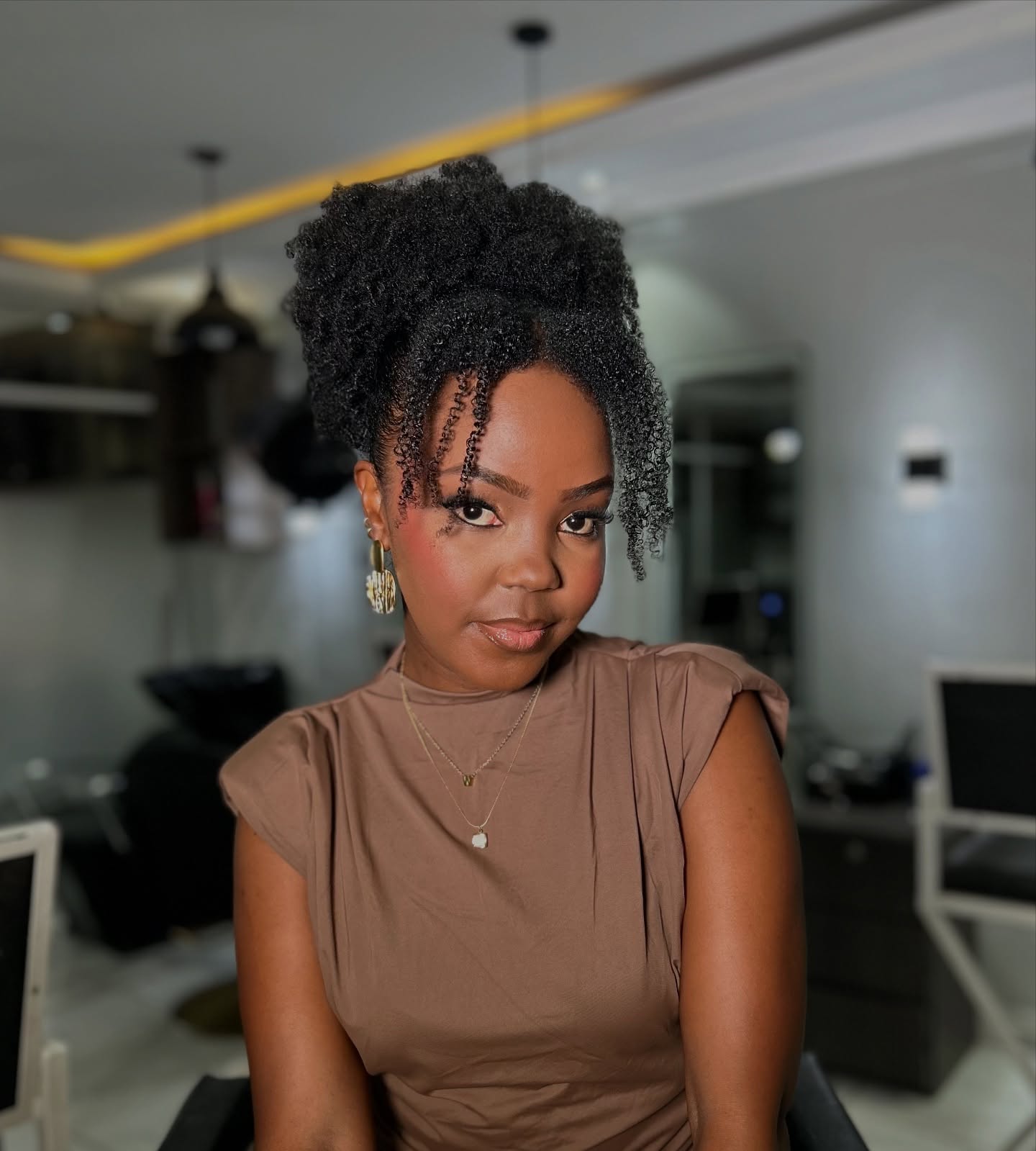 This chic hairstyle transforms natural curls into a stunning updo that oozes sophistication and flair. The defined texture adds depth, while the playful framing strands bring a fresh twist. Perfect for feeling confident and picture-ready any day of the week. This style blends elegance with ease, making it ideal for those who love embracing their natural beauty while keeping it stylish.
