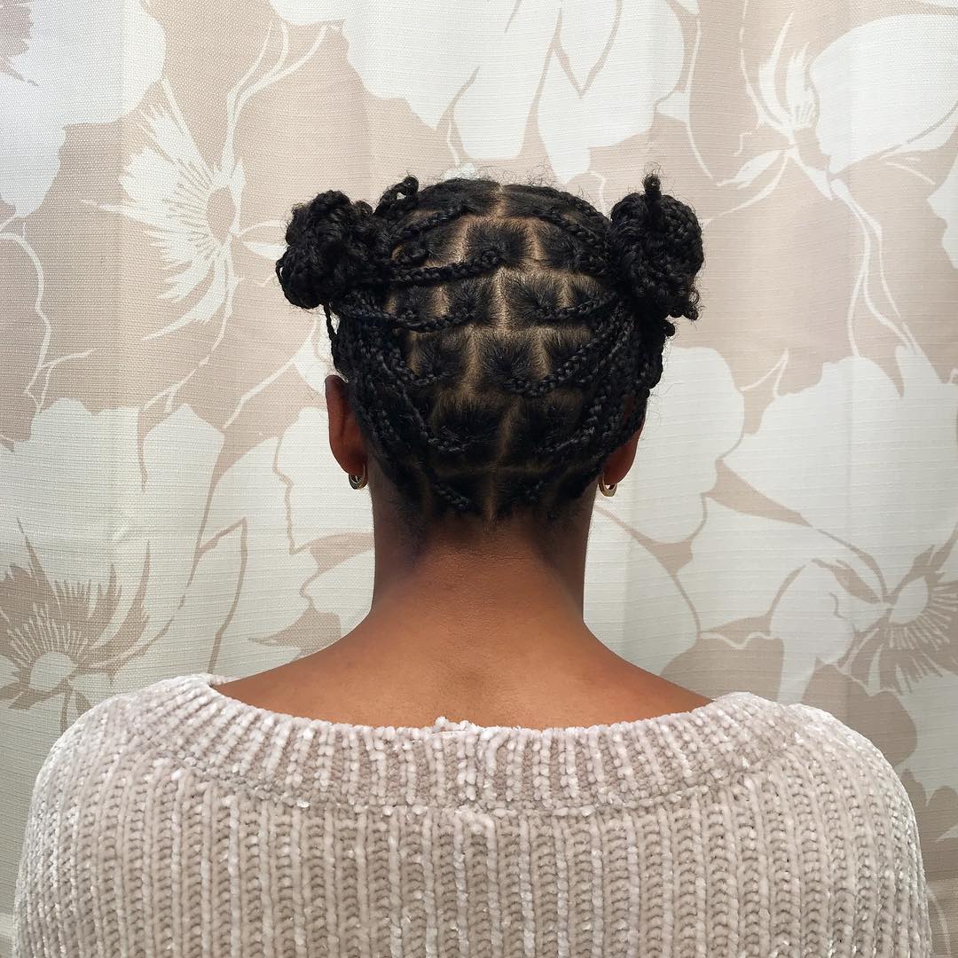 This eye-catching style features double buns with intricate braided patterns, creating a unique and playful look. The detailed braiding showcases careful attention to artistry while serving as a protective style for your hair. Ideal for those seeking a fun and confident expression, this hairstyle mixes creativity with practicality, effortlessly turning heads wherever you go.