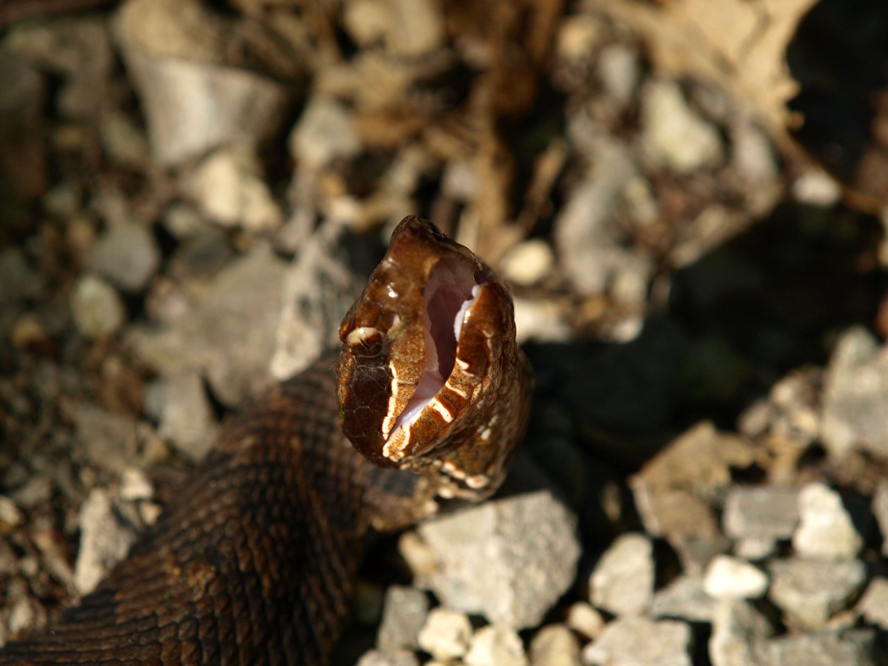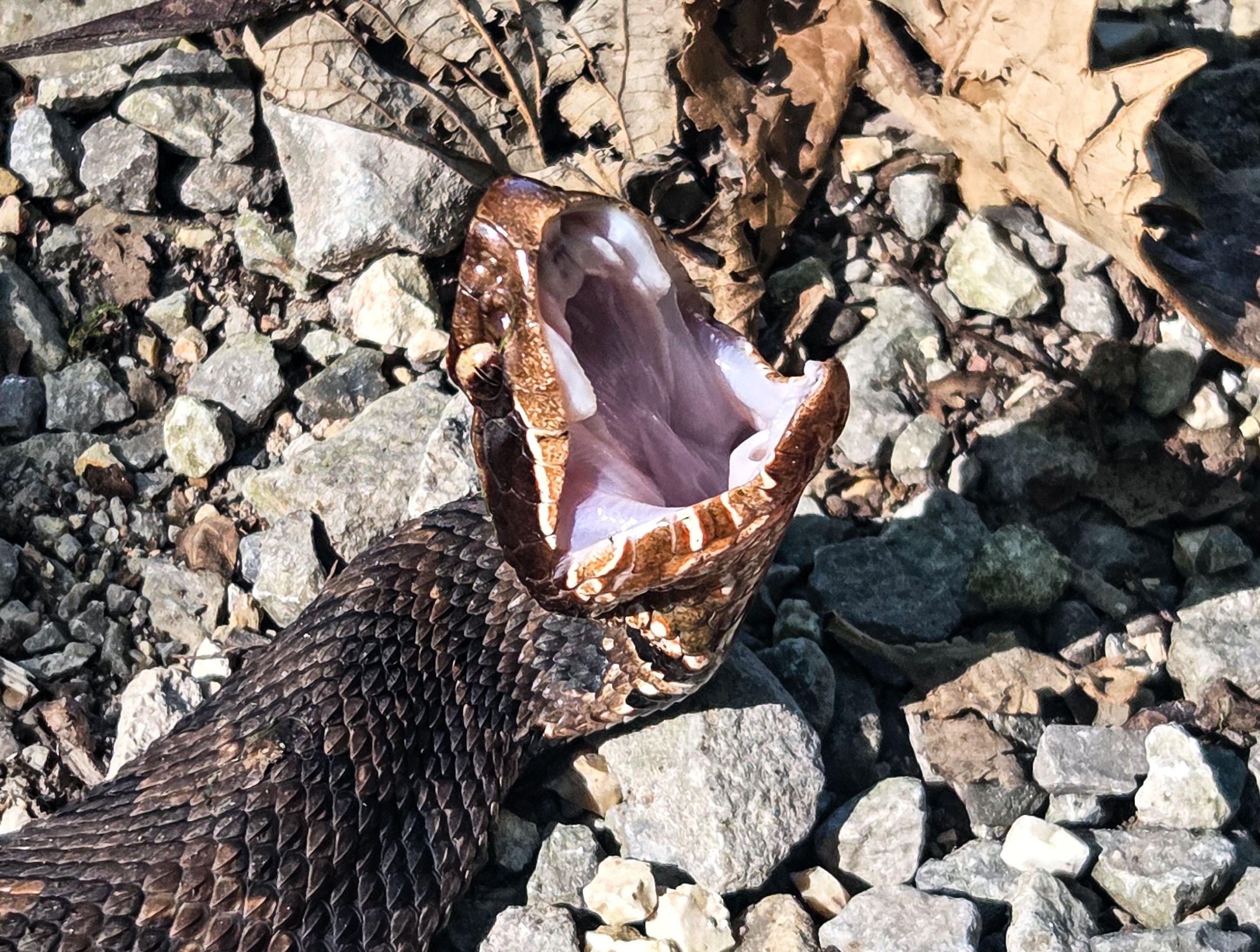 Thankfully the larger adults will warn you of their presence by hissing a bit and wiggling their tails and doing their open mouth threat. I'm sure this is mostly to warn you not to step on them.