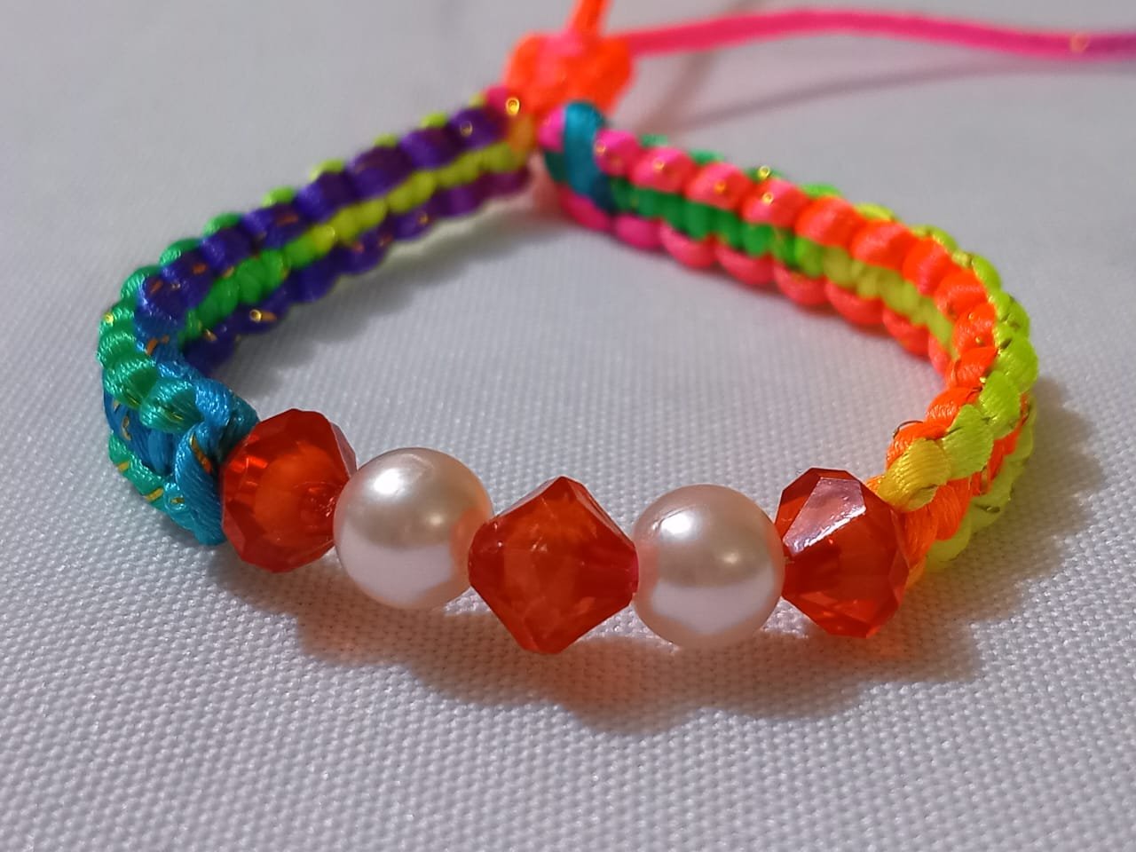 Today I am sharing with you a beautiful macramé bracelet made with colorful rattail cord, red beads, and plastic pearls, woven in a flat pattern to embellish and make this a very simple and eye-catching piece of jewelry. The flat weave is very easy to make but looks very nice with a very unique style that makes this bracelet a very special piece of jewelry.