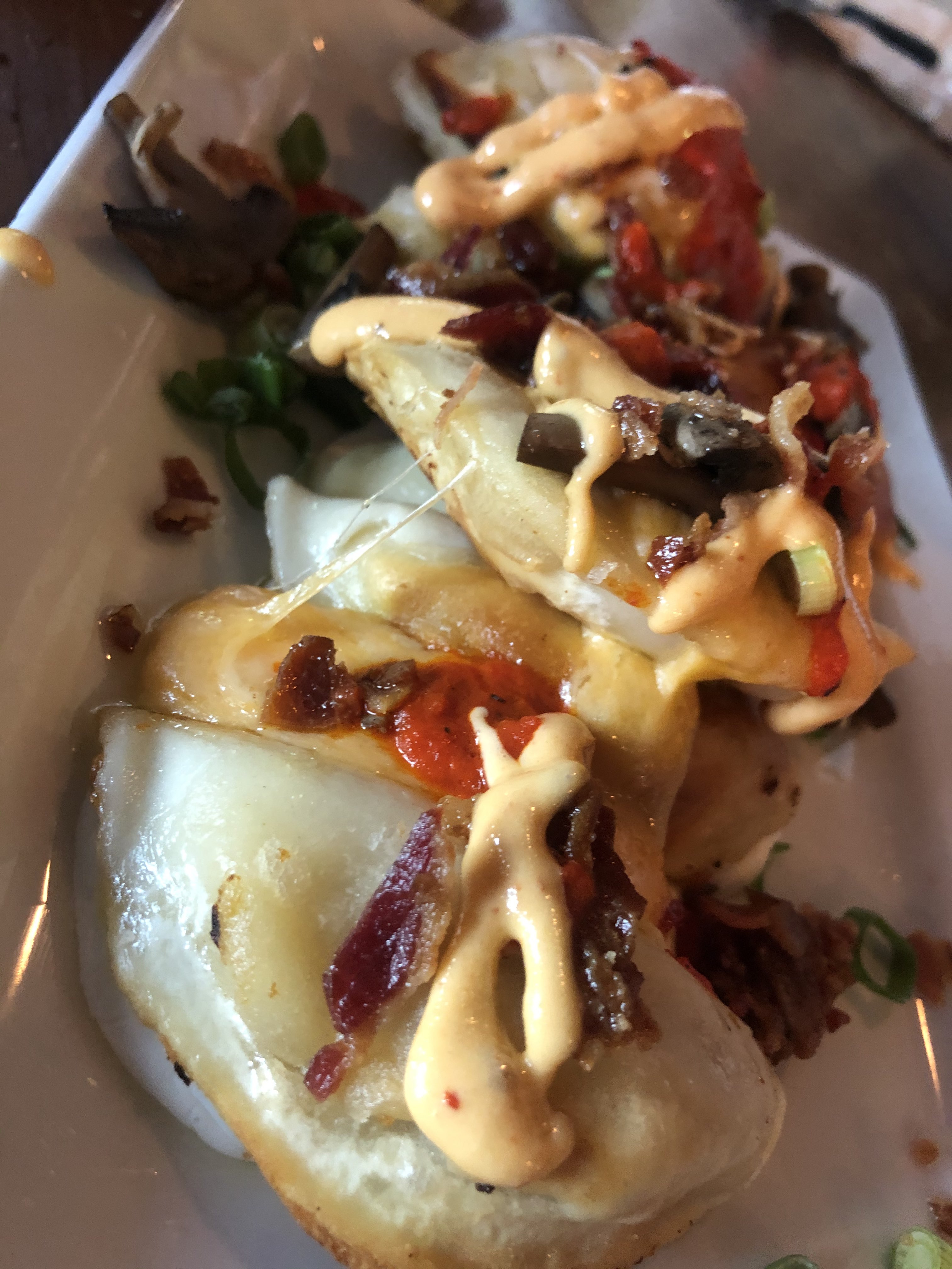 cheddar cheese stuffed dumplings, pan fried, chipotle mayo, roasted red pepper puree, sour cream & green onions. *Warehouse recommends...